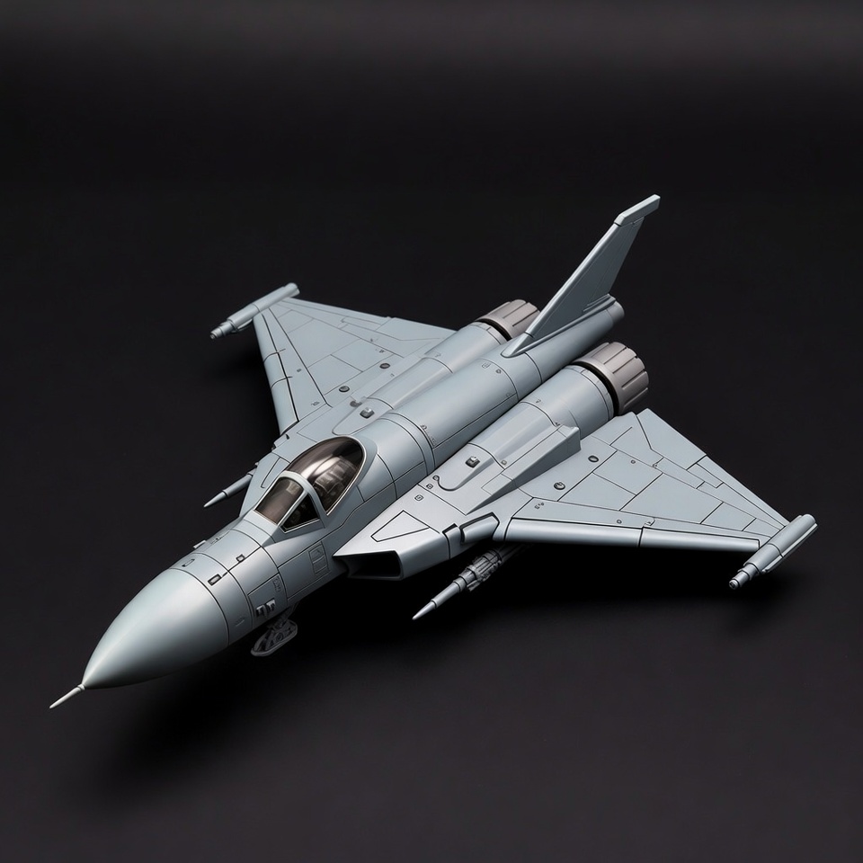 A detailed gray fighter jet model with delta wings and twin tail fins is displayed against a black background. The aircraft features a pointed nose, canopy cockpit, and rear engine exhausts. It has a sleek, angular design typical of modern military jets.