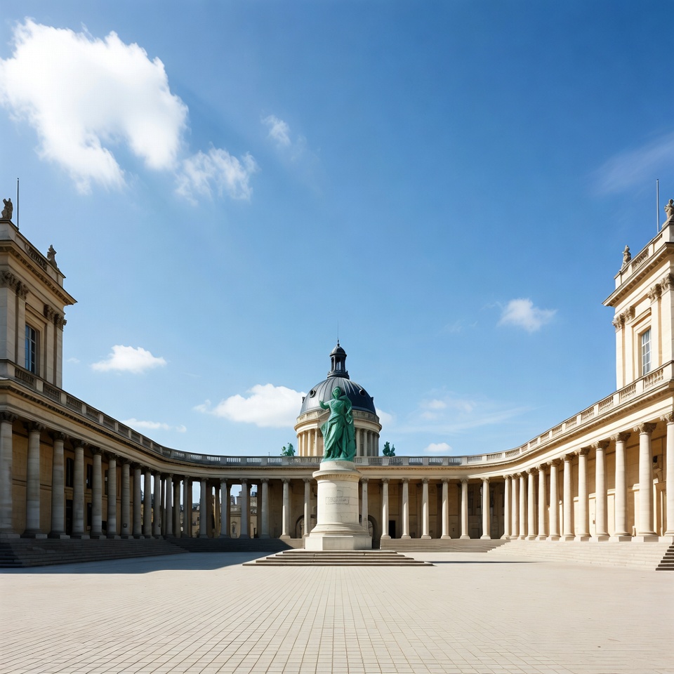European architecture, France, French landmark, Marianne, Paris, architecture, blue sky, clouds, columns, courtyard, dome, facade, green dome, historic building, landmark, monument, neoclassical, pediment, pillars, plaza, statue, stone pavement, symmetry, Pantheon