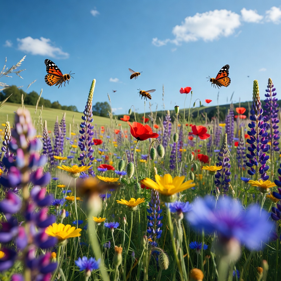 Colorful wildflower meadow with butterflies bees