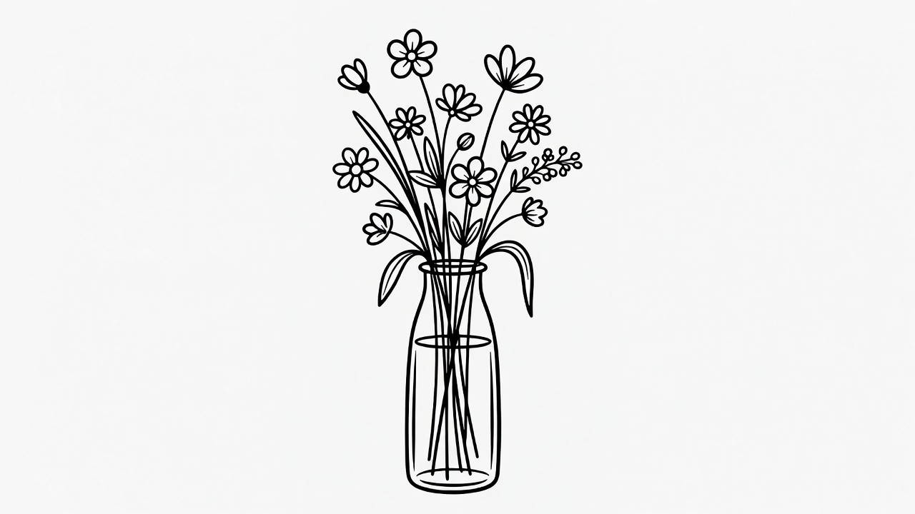 A hand-drawn line art illustration features a bouquet of various small flowers in a tall glass jar. The delicate stems and blooms, including daisies and other wildflowers, are rendered in simple black outlines on a white background. The jar has a narrow neck and stands upright with visible water lines inside.