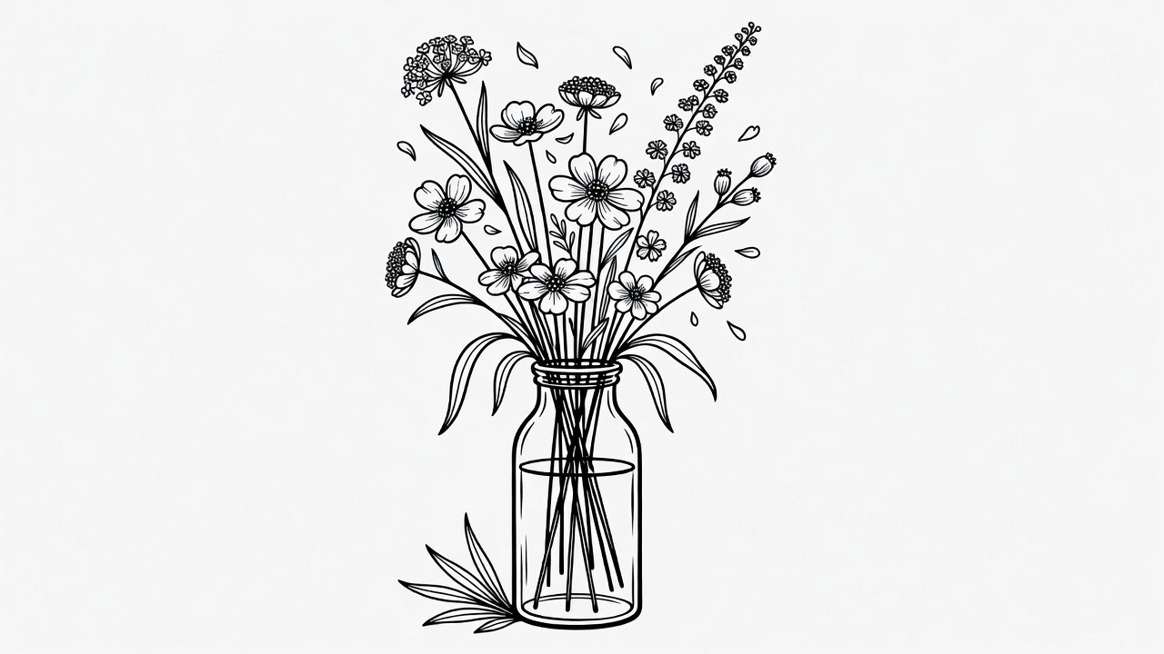 A black line art illustration depicts a bouquet of wildflowers including Queen Anne's lace and lavender stems arranged in a clear glass jar. Delicate petals and leaves extend gracefully from the vase on a plain white background. The minimalist drawing features intricate floral details with fine outlines.