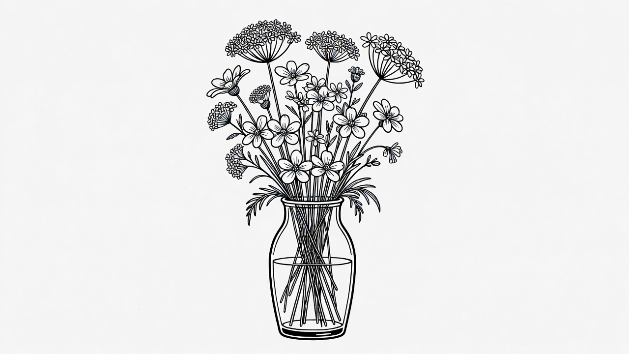 A black line art illustration depicts a bouquet of wildflowers including Queen Anne's lace and daisies arranged in a clear glass vase. The stems are bundled together with delicate leaves extending outwards. The design features intricate outlines on a white isolated background.