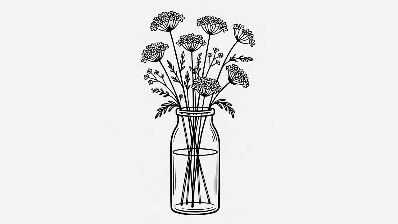 black and white, botanical sketch, bouquet, clipart, delicate flowers, doodle flowers, floral arrangement, flower drawing, glass jar, illustration, isolated background, lacy blooms, line art, minimalist art, simple illustration, stems, vase flowers, white flowers, wildflowers, Queen Anne's lace