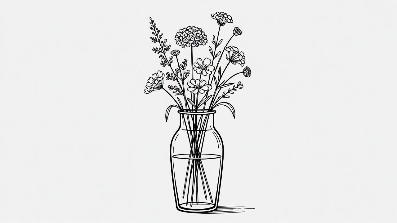 Line drawing flowers in vase