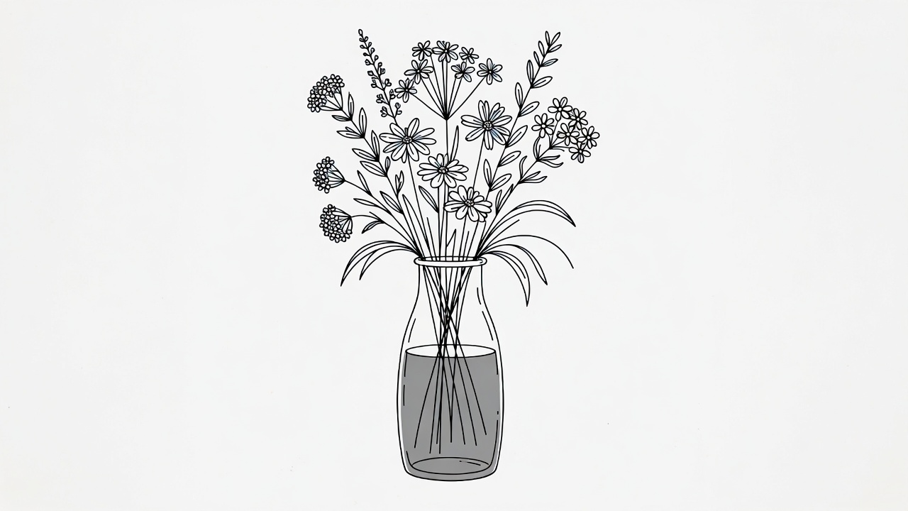 artistic flowers, black ink, botanical sketch, bouquet, daisies, delicate lines, doodle flowers, floral art, flower arrangement, flowers in vase, glass vase, hand drawn, illustration, ink art, lavender, line drawing, minimalist, simple illustration, sketch, stems, transparent vase, vase drawing, white background, yarrow, wildflowers