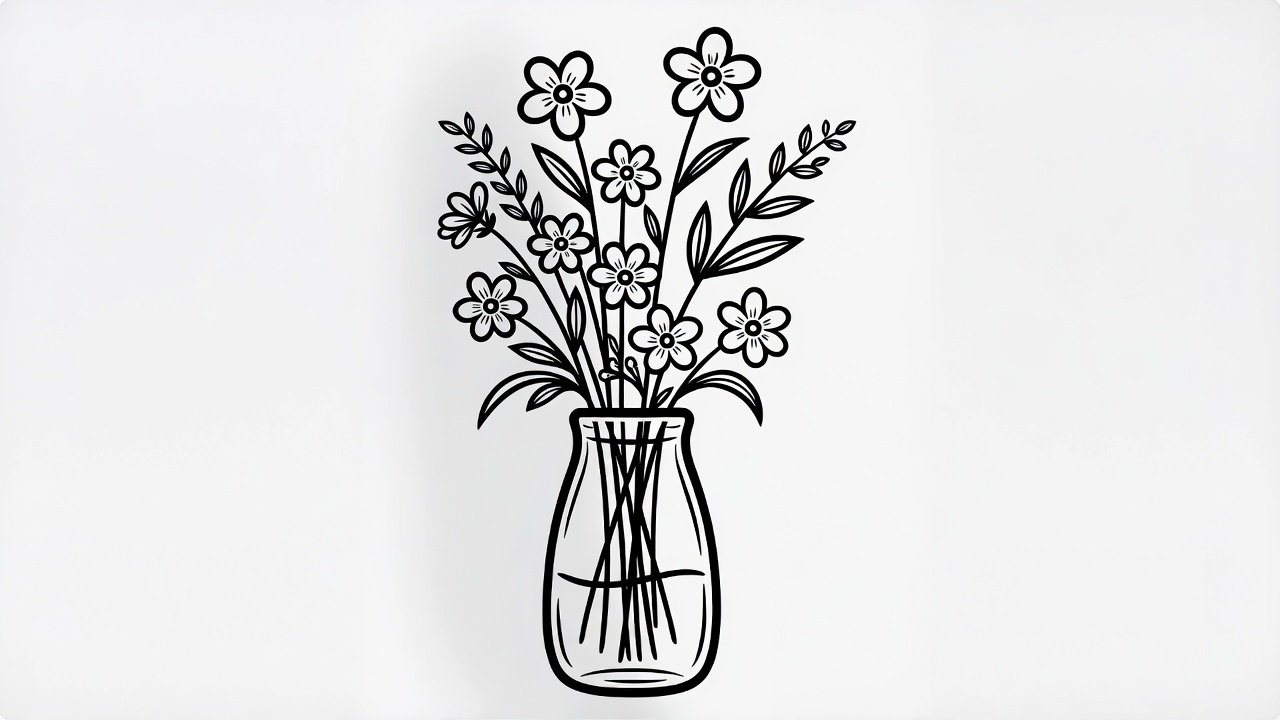 A black line art illustration depicts a bouquet of small daisy-like flowers with leaves arranged in a simple glass vase. The drawing features delicate stems and blooms in a minimalist style on a white background. The vase is transparent with visible water lines and stems.
