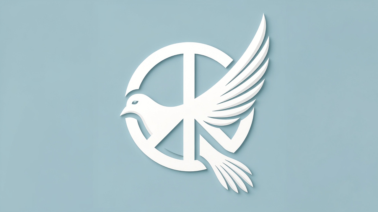 A white dove with outstretched wings forms a peace symbol on a light blue background. The illustration features a 3D cutout style with detailed feathers and a circular peace sign integrated into the bird's body. The design is clean and isolated against the solid background.