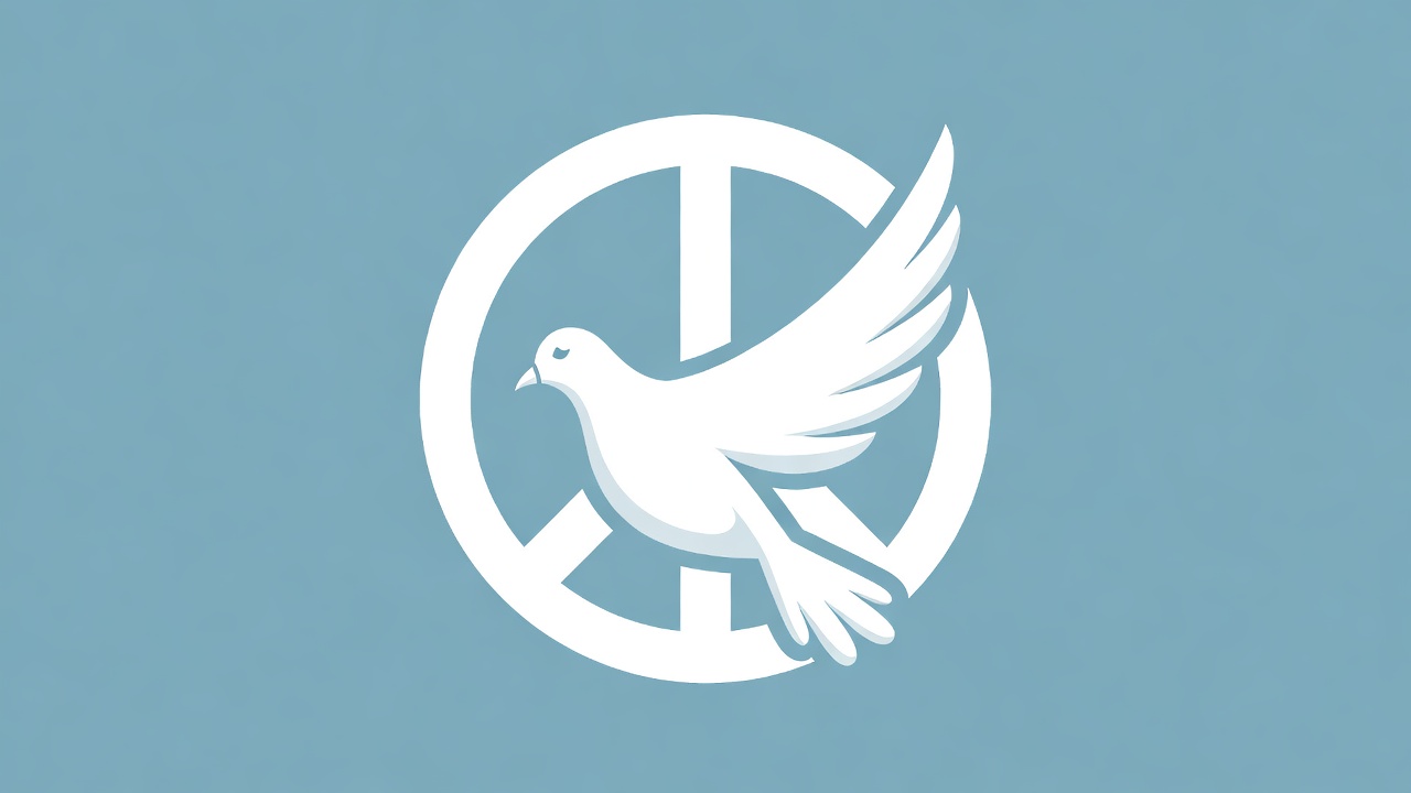 A white dove with outstretched wings forms the shape of a peace symbol on a light blue background. The illustration features clean lines and a minimalist design. The dove's eye and feathers are detailed in white.