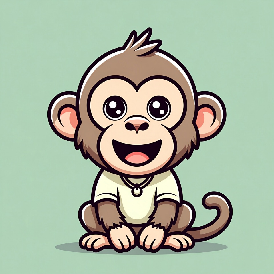 adorable animal, animal, baby monkey, big eyes, brown fur, chibi style, clipart, cute monkey, fun monkey, green background, illustration, isolated background, kawaii monkey, monkey face, necklace, smiling monkey, tail, white shirt, wide smile, cartoon monkey