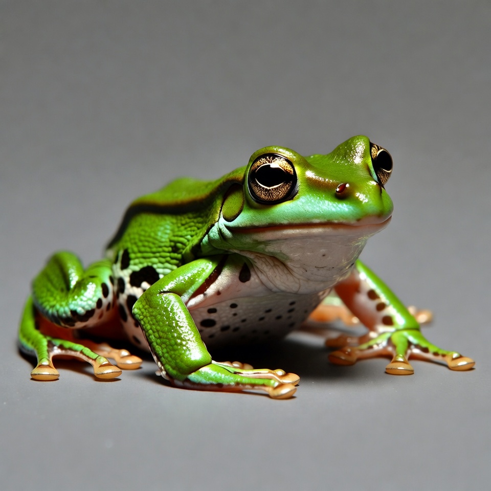 amphibian, animal, black spots, exotic frog, frog closeup, glossy skin, golden eyes, gray background, isolated, large eyes, macro photo, nature, sitting frog, spots, stripes, tree frog, vibrant green, white belly, wildlife, yellow toes, green frog