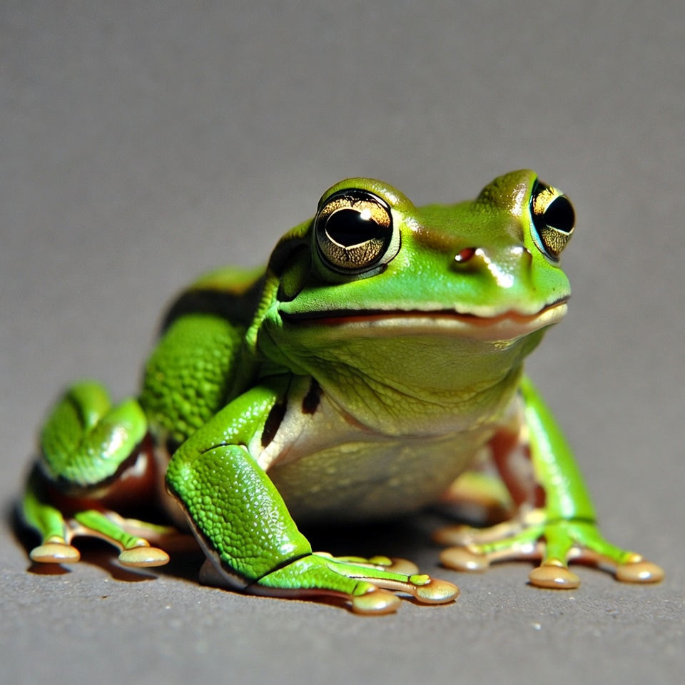 A vibrant green tree frog with large golden eyes sits on a gray surface. Its smooth skin features darker green markings and orange toes. The frog faces forward with a slightly open mouth.