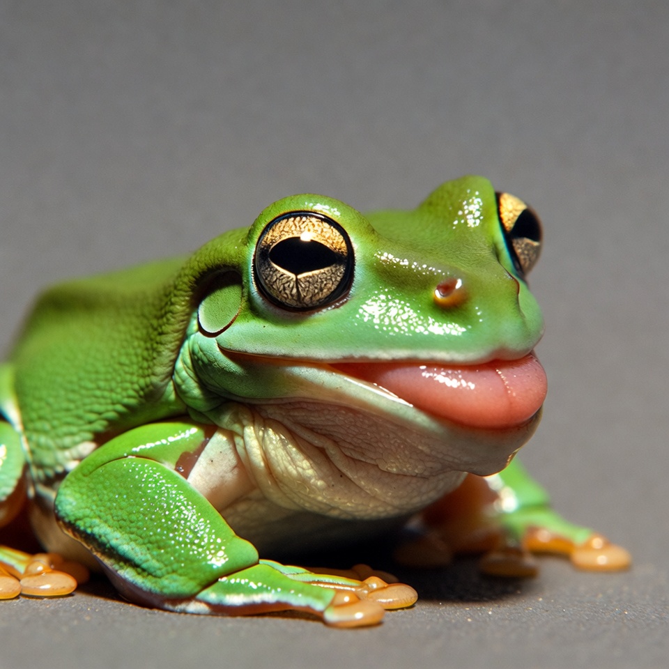 Green tree frog sticking tongue out