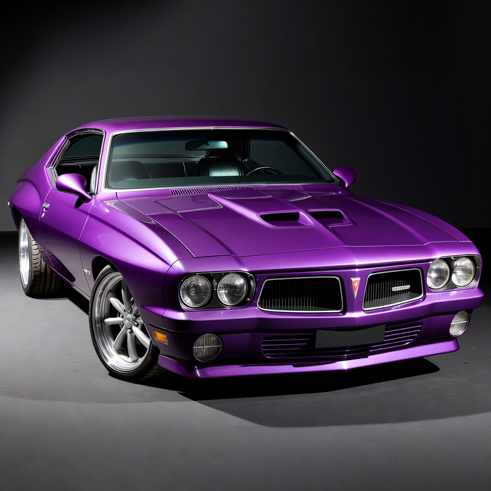 A vibrant purple Pontiac Firebird muscle car is showcased frontally against a dark background. It features a prominent hood scoop, sleek coupe body, chrome wheels, and round headlights. The car has a glossy finish with Pontiac grille and emblem clearly visible.
