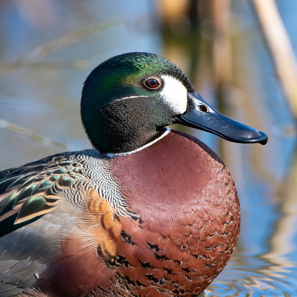 bird, blue bill, closeup, detailed feathers, duck, feathers, green head, iridescent head, male duck, nature, outdoors, pond, red chest, reeds, swimming duck, water bird, waterfowl, white neck, wildlife, mallard duck