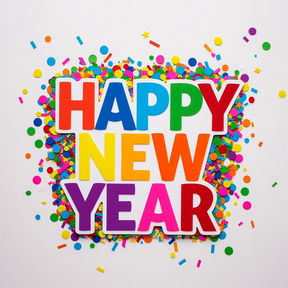 bold text, celebration, clipart, colorful confetti, confetti, festive, holiday graphic, illustration, isolated background, joyful, multicolored, new year, new years eve, party, rainbow letters, stars, typography, vibrant colors, white background, happy new year