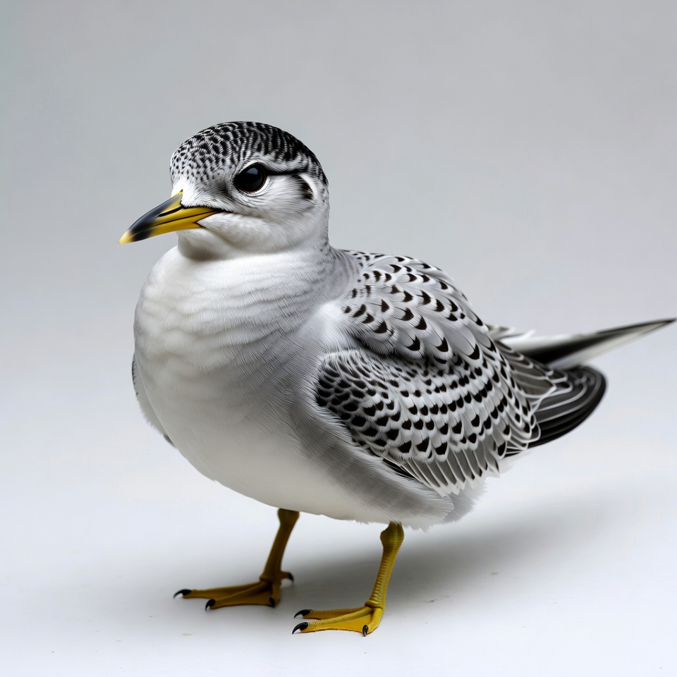 animal, avian, bird, feathers, isolated, nature, seabird, shorebird, speckled feathers, standing bird, tern, white background, wildlife, yellow beak, yellow legs, black tern