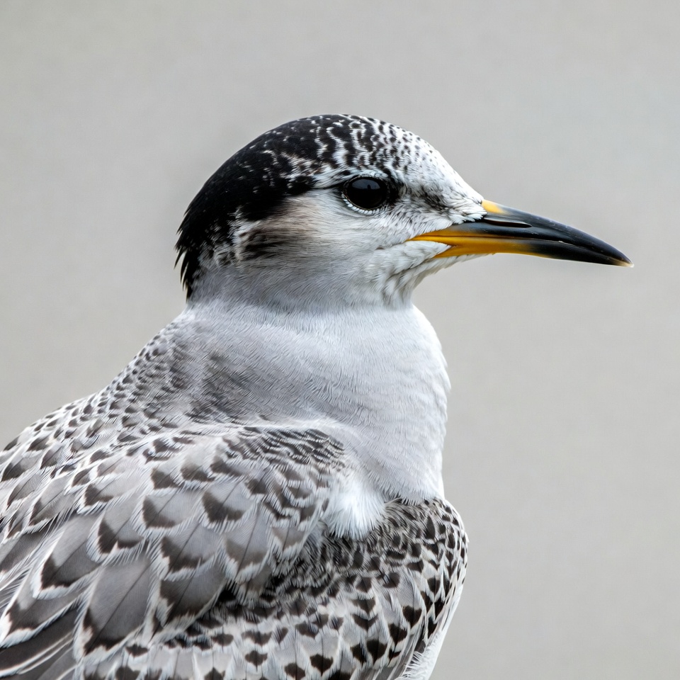 A black tern with intricate black and white speckled feathers on its head and wings stands in profile against a plain gray background. Its sharp yellow beak protrudes prominently, and its dark eyes gaze forward. The bird's underbelly is white, contrasting with its spotted upper body.