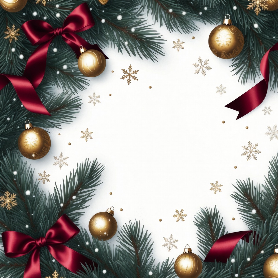 Christmas clipart, Christmas decorations, Christmas frame, baubles, clipart, evergreen, festive border, fir branches, gold baubles, gold ornaments, golden balls, holiday border, holiday decor, illustration, isolated, pine branches, pine needles, red bow, red ribbons, ribbon bow, satin bow, seasonal wreath, shiny ornaments, snow flurry, snowflakes, white background, winter theme, Christmas wreath