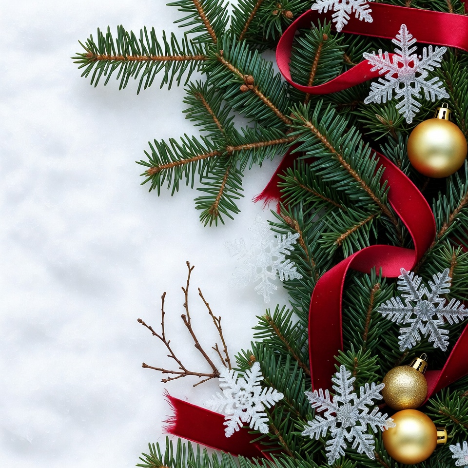 Fir branches with green needles are arranged on a white background. Red satin ribbon wraps around the branches, adorned with white snowflake ornaments and gold Christmas balls. Small twigs add texture to the festive holiday decoration.