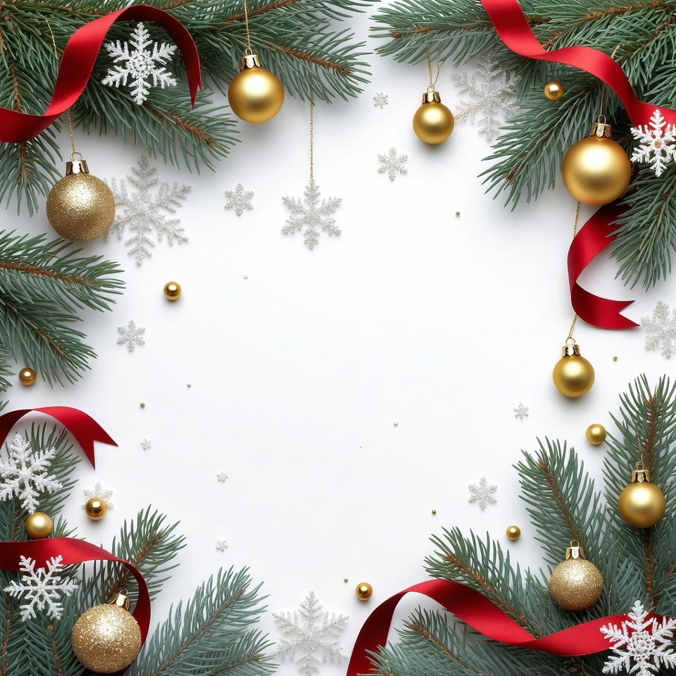 A festive border frames a white space with lush green fir branches, red satin ribbons, and shiny gold Christmas baubles. Delicate white snowflakes and small gold beads are scattered throughout the arrangement. The elements are arranged symmetrically on a clean white background, perfect for holiday designs.