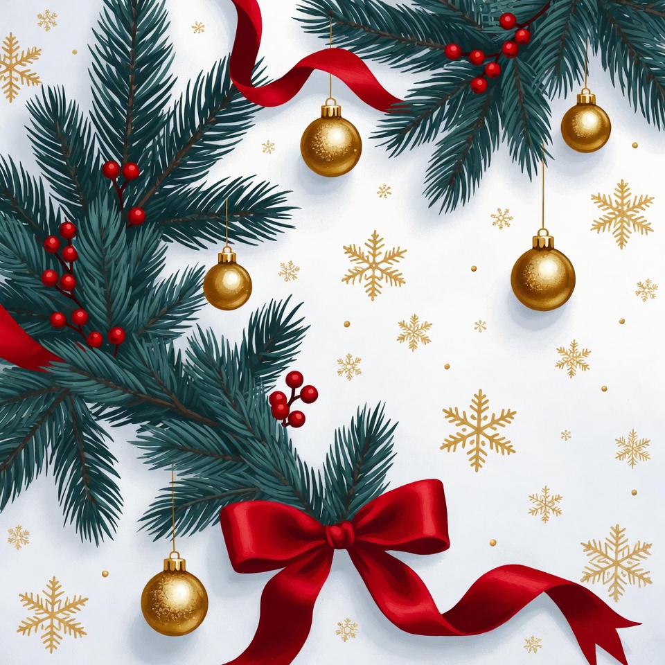 Festive green fir branches adorned with red berries and red ribbons are arranged on a white background. Golden Christmas baubles hang from the branches, surrounded by scattered gold snowflakes. A large red bow sits prominently at the bottom center.