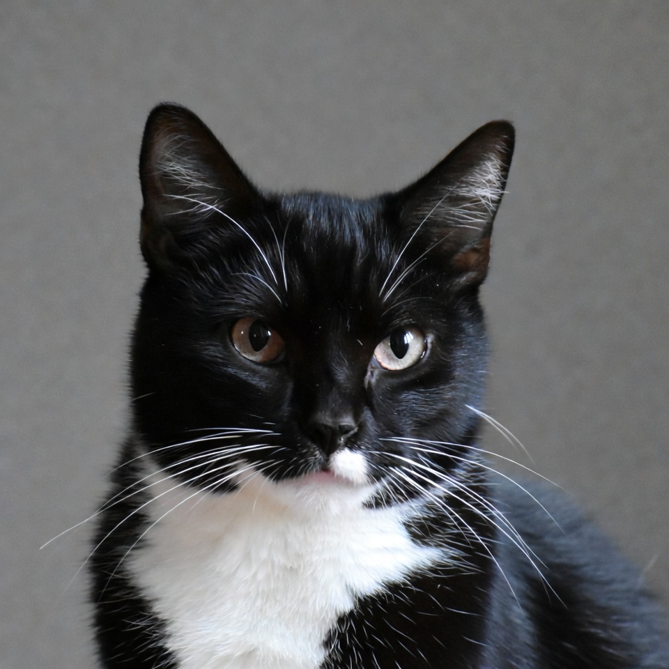 animal, black cat, cute cat, domestic cat, ears, feline, gray background, kitty, orange eyes, pet, portrait, tuxedo cat, whiskers, white cat, cat