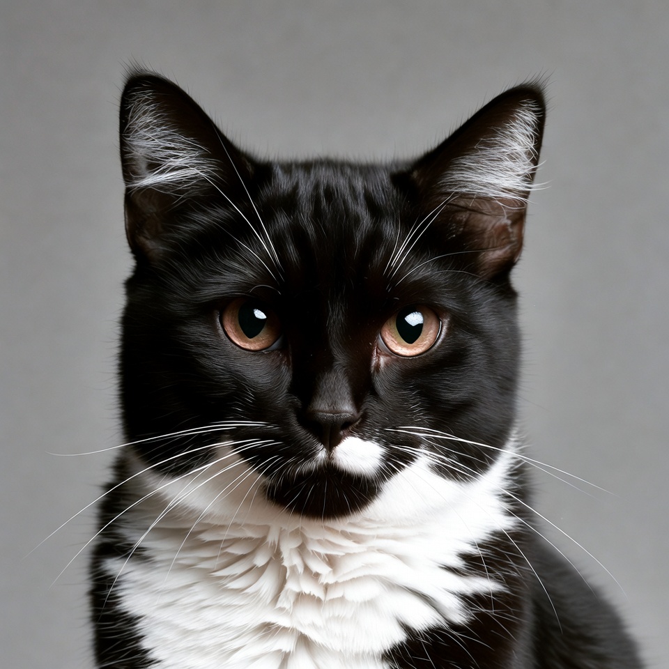 animal, cat, cat face, close-up, cute cat, domestic cat, feline, gray background, orange eyes, perked ears, pet, portrait, shiny fur, tuxedo cat, whiskers, white chin, black cat