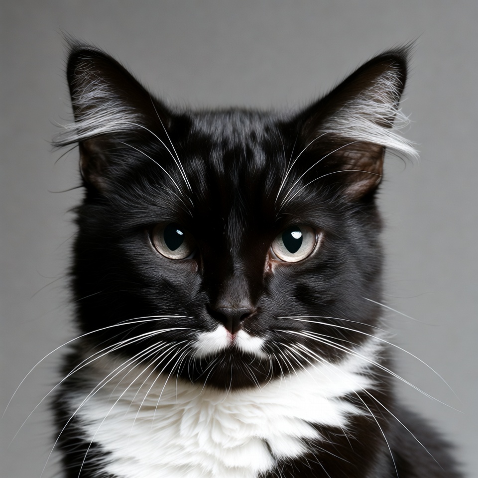animal, black cat, chest markings, close-up, cute cat, feline, fluffy fur, green eyes, isolated background, pet, pointed ears, portrait, tuxedo cat, whiskers, white whiskers, cat