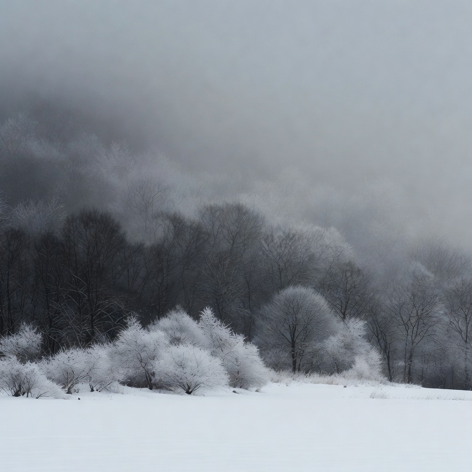 atmospheric fog, bare trees, cold weather, fog, foggy trees, frosty branches, hoarfrost, mist, monochrome tones, nature, outdoors, overcast sky, snow field, snowy bushes, white trees, winter forest, winter scene, wooded hills, snowy landscape