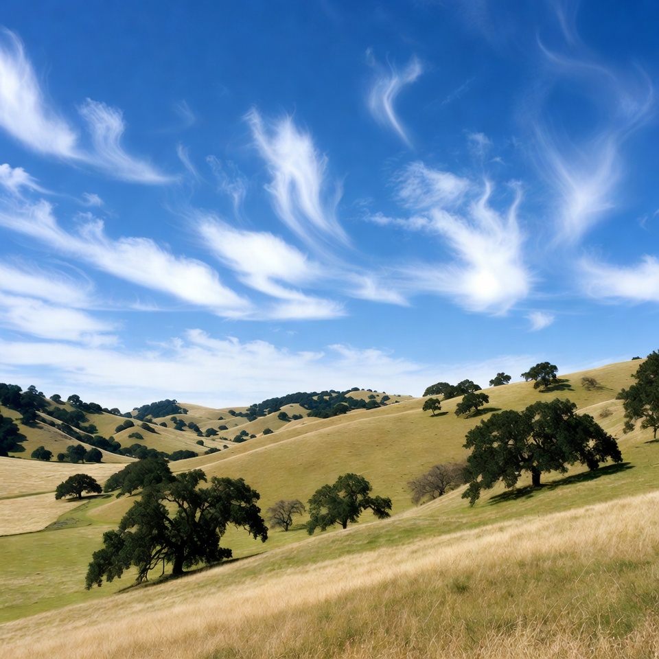 California hills, blue sky, clear sky, clouds, dry grass, field, golden hills, grasslands, green hills, hills, landscape, meadow, nature, oak trees, oak woodland, outdoors, rural scenery, scenic, sky, summer landscape, sunny day, trees, white clouds, wispy clouds, rolling hills
