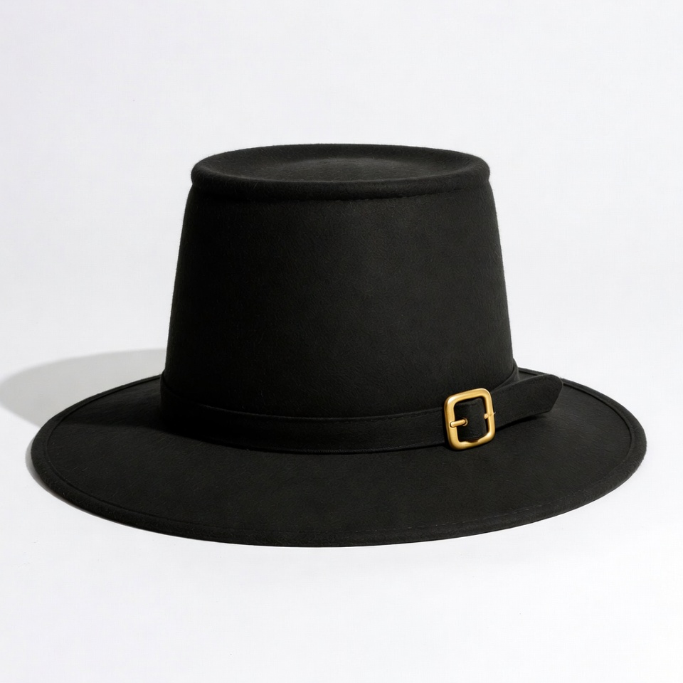 accessory, black hat, fashion accessory, felt hat, gold buckle, hat closeup, hatband, isolated background, mens hat, pilgrim hat, tall crown, vintage hat, wide brim, top hat
