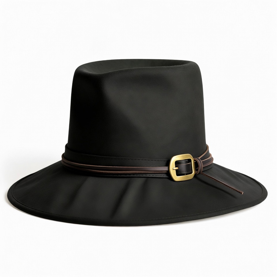 black hat, black leather, brimmed hat, cowboy hat, fashion accessory, fedora, gold buckle, headwear, isolated background, leather band, leather hat, stylish hat, wide brim, wide brim hat, hat