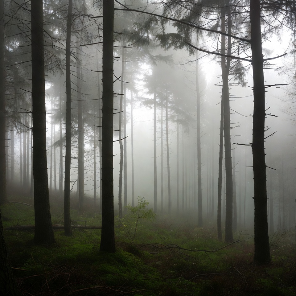 atmospheric fog, coniferous trees, dense forest, evergreen trees, fog shrouded trees, foggy woods, forest fog, forest landscape, green plants, mist, misty landscape, misty trees, mossy ground, nature scene, pine forest, pine trees, tall trees, woodland mist, woods, foggy forest
