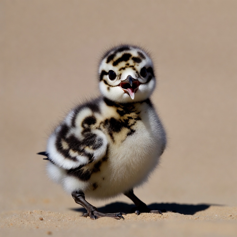 A small fluffy chick with black and white spotted plumage stands on sandy ground. It has large expressive eyes, a small orange beak slightly open, and thin legs. The bird is centered against a beige sandy background.