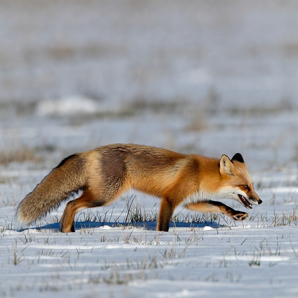 A red fox with bushy tail prowls through a snowy field with patches of dry grass. It moves low to the ground, ears perked and mouth slightly open, appearing to stalk prey. Sunlight illuminates its orange fur against the white snow.