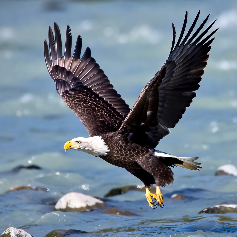 A bald eagle with white head and yellow beak soars with widespread dark wings over a flowing river. Its talons are extended downward toward the water surface dotted with white rocks. The eagle's feathers are detailed against the blue-gray river background.