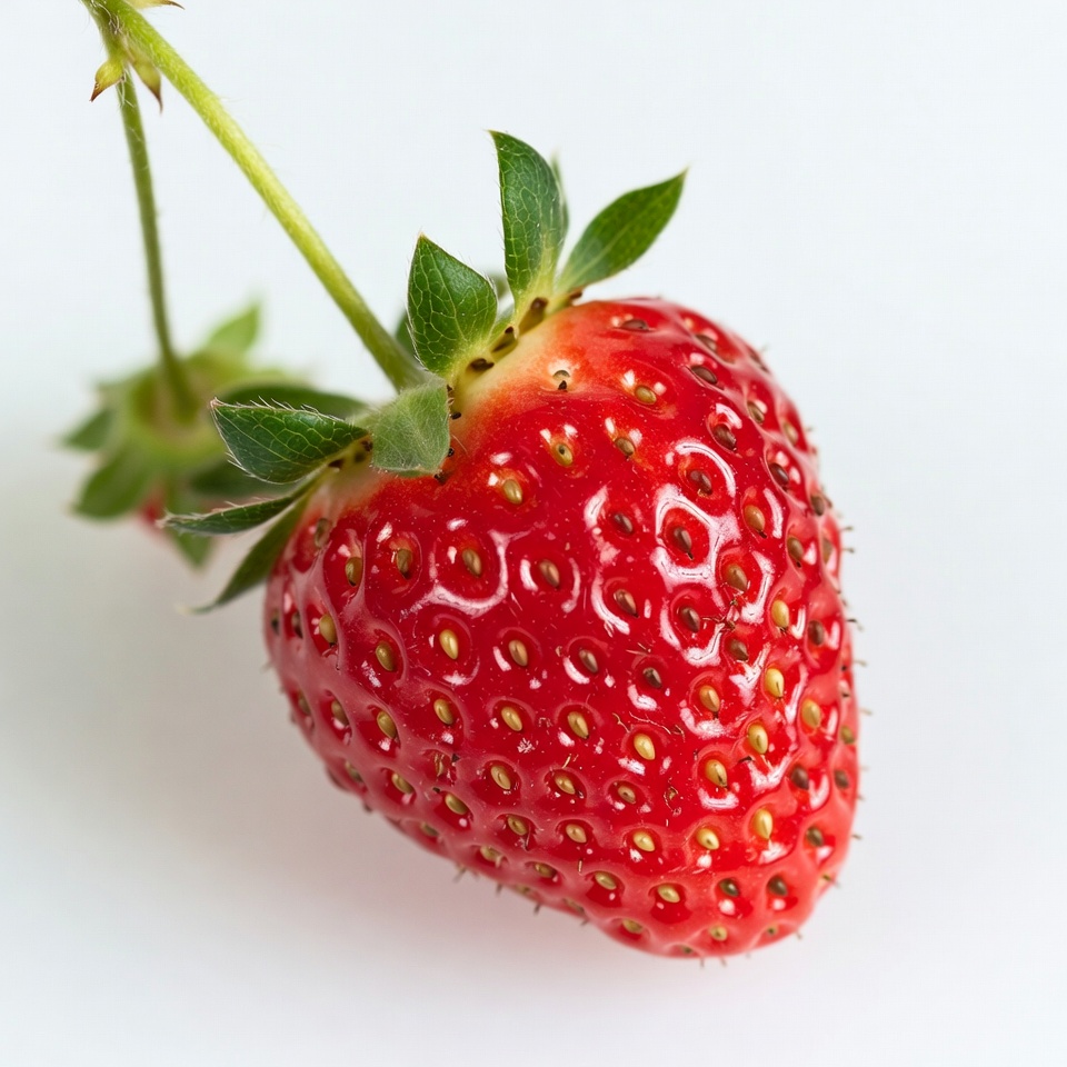 A single ripe red strawberry with green leaves and stem is isolated on a white background. The berry features a textured surface with small seeds and a calyx at the top. The stem angles slightly to the side.