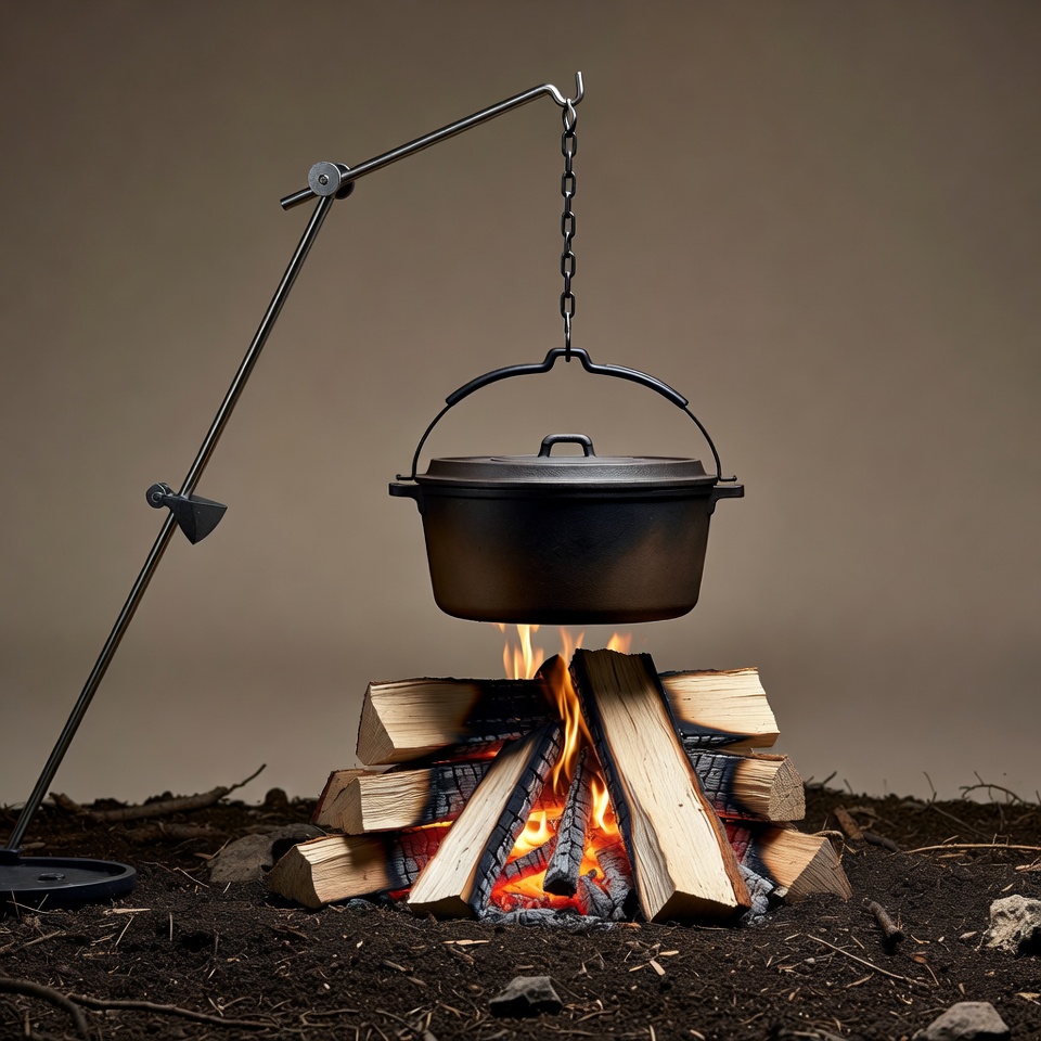 A black cast iron pot hangs from a metal tripod arm over a campfire. The fire burns brightly with stacked logs beneath the suspended pot. The setup is on a dirt ground with a neutral background.
