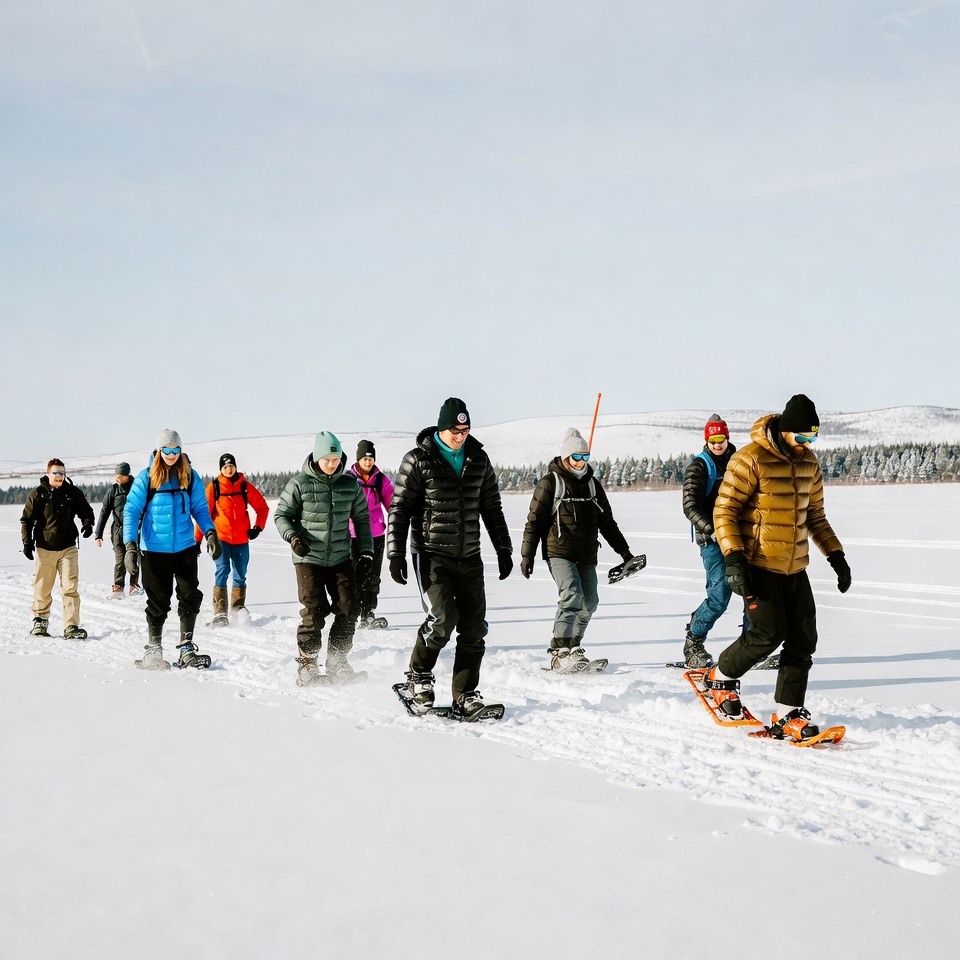 A diverse group of men and women in colorful winter jackets and backpacks snowshoes across a snowy frozen lake. They wear hats, gloves, and some face masks while trekking in a line through fresh snow. Snow-covered hills and evergreen trees form the background under a clear sky.