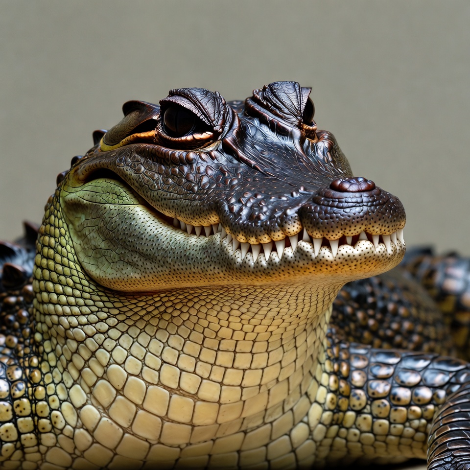 A close-up view of an American alligator's head with detailed dark scales and ridges. The alligator has piercing yellow eyes with dark outlines and a wide-open mouth revealing sharp white teeth. It rests on a neutral gray background, showcasing its textured green and black skin.