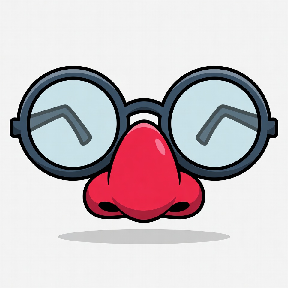 black frames, blue lenses, cartoon, clipart, comedy prop, costume accessory, disguise, funny glasses, glasses, humor, illustration, isolated background, novelty glasses, red nose, vector, clown nose