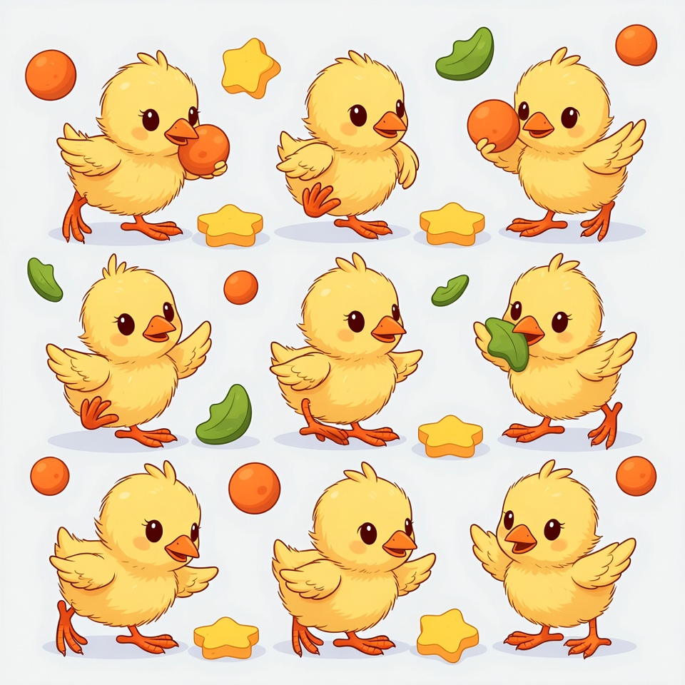A collection of adorable cartoon chicks in various playful poses on a white background. Some chicks hold orange balls, green beans, or yellow stars, while others flap their wings or stand cutely. The vibrant illustration features fluffy yellow chicks with big eyes and orange beaks and feet.