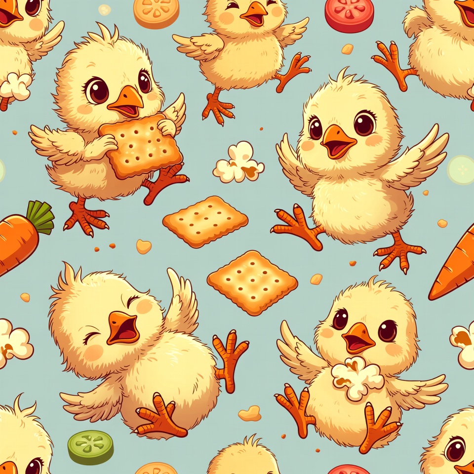 Adorable cartoon chicks with fluffy yellow feathers play and eat snacks on a light blue patterned background. They hold crackers, popcorn, carrots, tomatoes, and cucumbers while flapping wings happily. The seamless illustration features multiple chicks in various playful poses surrounded by scattered food items.