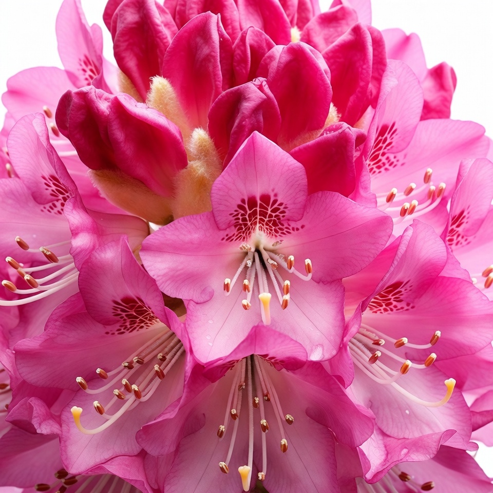 bloom, flower closeup, flowering plant, fuzzy stems, garden flower, magenta petals, petals, pink flower, pink rhododendron, rhododendron bloom, stamens, white background, yellow stamens, rhododendron