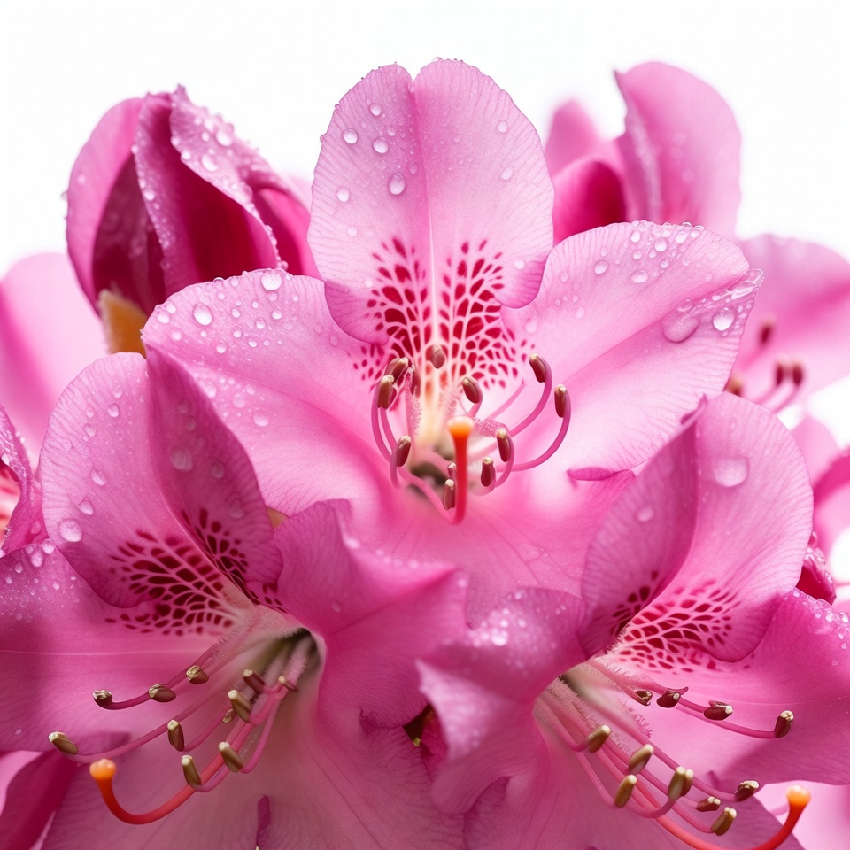A close-up of a vibrant pink rhododendron flower features detailed pink petals with red veins and yellow stamens. Water droplets glisten on the petals and edges. The flower is isolated against a white background.