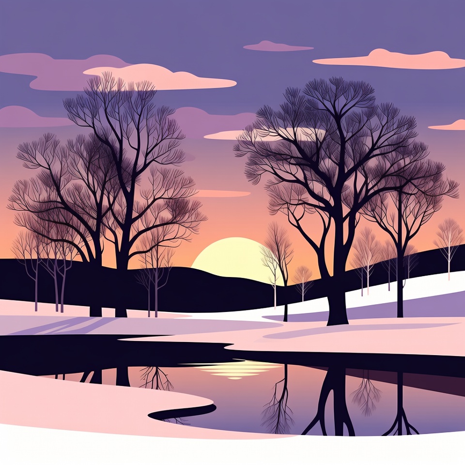 bare trees, cold weather, frozen pond, hills, illustration, nature, orange sun, outdoors, pink clouds, purple sky, reflection, setting sun, silhouettes, snow, snowy landscape, twilight, vector art, winter sunset