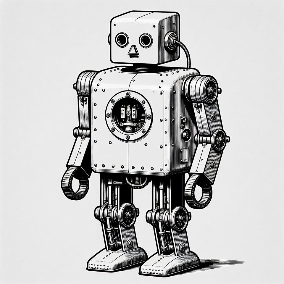 antenna, black and white, clipart, gears, humanoid robot, illustration, isolated background, line art, machine, mechanical robot, porthole, retro robot, rivets, robot illustration, sci-fi, steampunk, vintage robot, robot