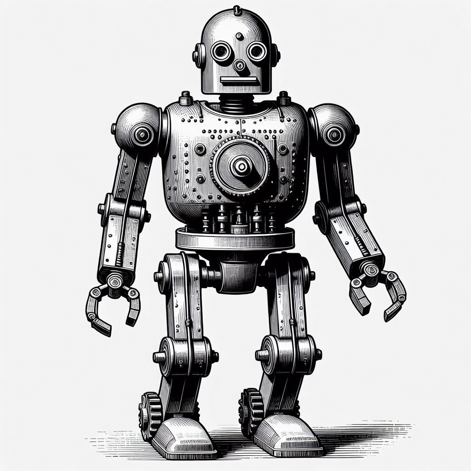 claw hands, gears, illustration, isolated background, line art, mechanical robot, metallic body, retro robot, rivets, robot standing, round eyes, sci-fi robot, silver robot, steampunk, vintage robot, wheels, robot