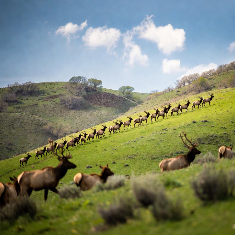 animals, antlers, blue sky, bushes, deer family, elk herd, grass, green hills, herd walking, hillside, majestic elk, nature, outdoors, rolling hills, white clouds, wildlife, elk