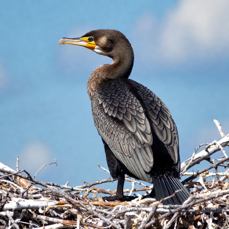 avian, bird, black feathers, blue sky, clouds, double-crested cormorant, isolated background, nature, nest, perched, sea bird, twigs, water bird, wildlife, wings spread, yellow bill, cormorant